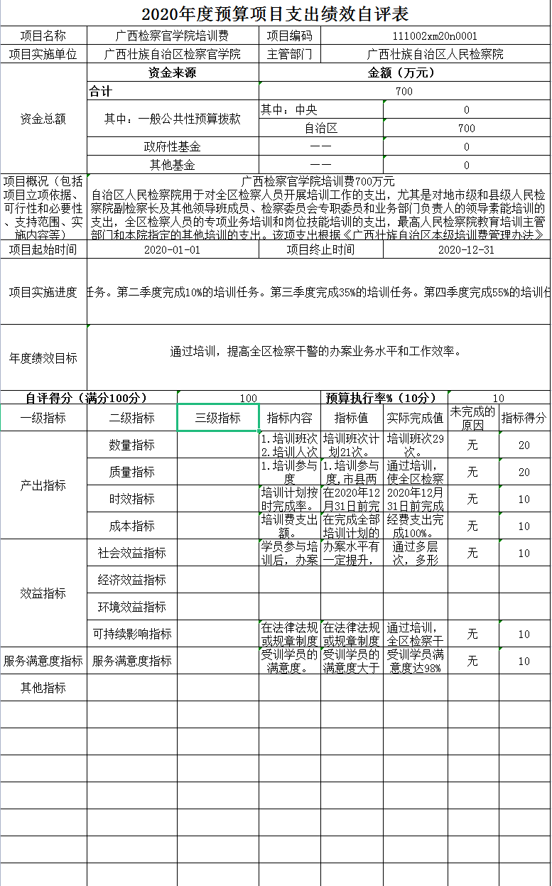 (3)广西检察官学院培训费项目自评分100分。主要经验做法:一是加强组织领导,提高思想认识;二是细化分工,落实责任;三是强化督导检查。存在的问题:一是培训形还不存丰富;二是培训内容还可以进一步充实。工作改进建议:加强师资队伍管理,提高培训效果。
