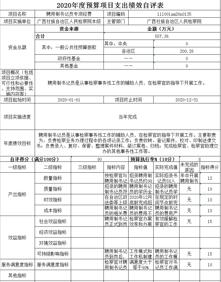 (5)聘用制书记员专项经费项目自评分100分。主要经验及做法:严格按照报名、资格审查、岗位基础知识测试、技能测试、考核、研究提出拟转任人选、公示、任职等程序进行书记员的招聘。聘用制书记员正式到岗后,有效缓解员额制检察官程序性、事务性司法工作的压力,确保检察官的主要精力投入司法案件实体工作当中,稳步提高司法办案的工作效率。
