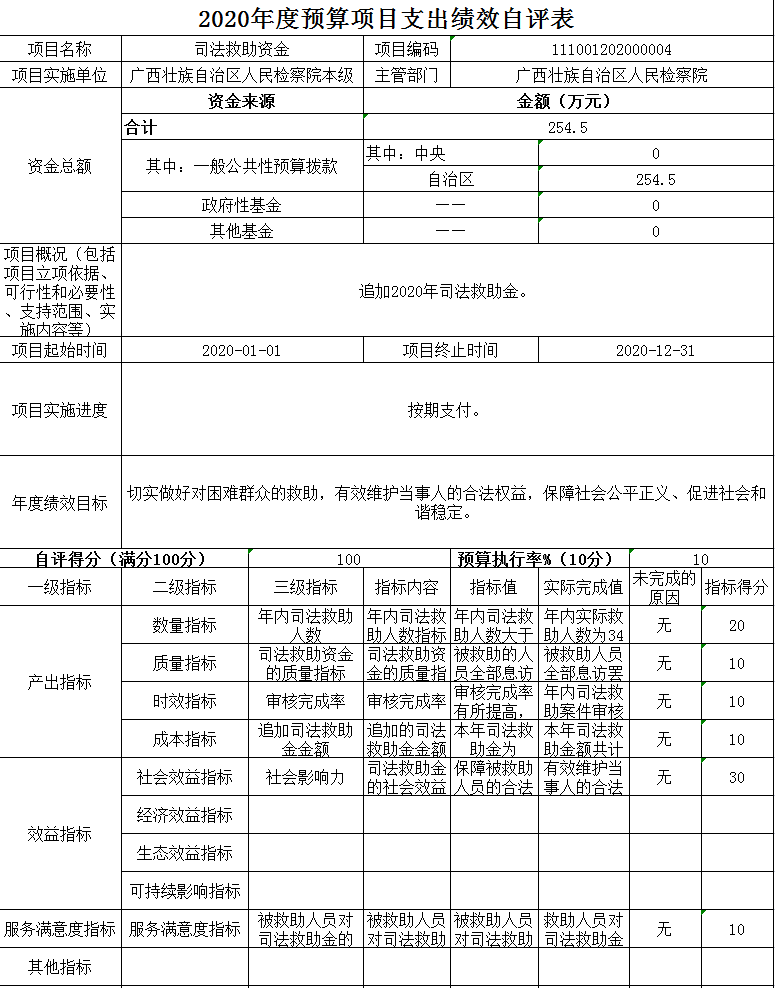 (6)司法救助资金项目自评分100分。主要经验和做法:我院高度重视,设立部门主要负责,收集整理相关资料,按照上级下达的指标体系,对申报内容、实施情况等作出评价,有计划有安排的开展情况。建议和改进措施:科学合理编制预算,严格执行预算。