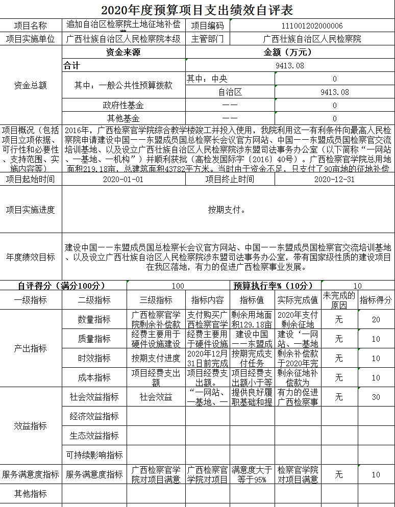 (8)自治区检察院土地征地补偿费项目自评分100分。主要经验和做法:为提高我区争取国家级项目在广西落地的成功率,同时根据自治区党委办公厅关于印发《<深入推进激励干部新时代新担当新作为工作实施方案>等6个文件的通知》精神,我院申请继续支付广西检察官学院(仙葫大道123号)剩余土地征地补偿费9413.08万元以获得该地块使用权。在此基础上,向最高人民检察院申报建设中国——东盟检察官研修基地等相关项目,从而提升广西检察机关争取最高检支持项目的硬实力。建议和改进措施:积极监督项目进展和项目质量是否达标。