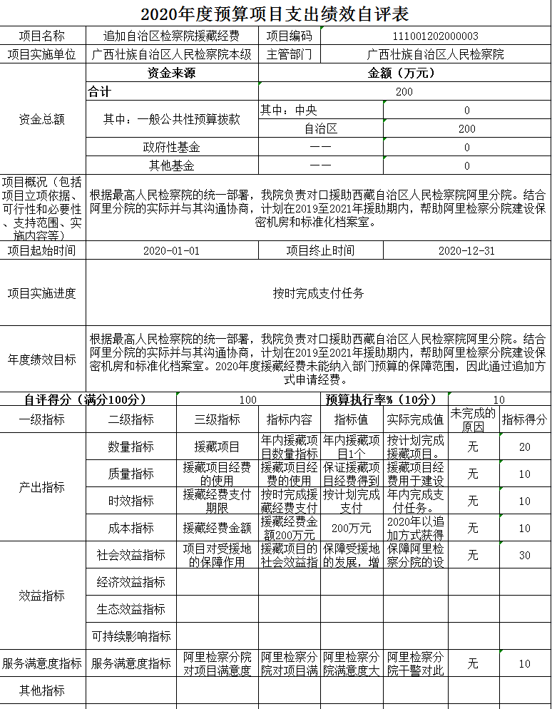 (9)援藏经费项目自评分100分。主要经验和做法:我院结合阿里的实际情况,多次积极联系分院与其沟通,并派出干警赴藏考察,提出宝贵的建议,帮助阿里分院院建设保密机房和标准化档案室。建议和改进措施:重视项目的进展情况,确保保密机房和标准化档案室按期完成。