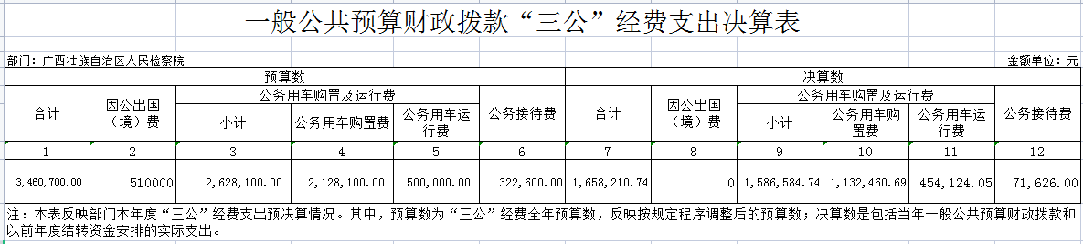 十二、“三公”经费:纳入自治区财政预决算管理的“三公”经费,是指自治区本级各部门用财政拨款安排的因公出国(境)费、公务用车购置及运行费和公务接待费。其中因公出国(境)费反映单位公务出国(境)的国际旅费、国外城市间交通费、住宿费、伙食费、培训费、公杂费等支出;公务用车购置及运行费反映单位公务用车车辆购置支出(含车辆购置税)及租用费、燃料费、维修费、过路过桥费、保险费、安全奖励费用等支出;公务接待费反映单位按规定开支的各类公务接待(含外宾接待)支出。