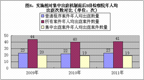 从表8的数据可以看出可知,依照刑事诉讼法中简易程序有关适用范围的新规定,适用简易程序审理的案件数量将增加,适用普通程序审理的案件数量相反则减少,简易程序审理的案件数量变成普通程序审理的案件数量的2倍多;从表9的数据及图5、图6的比较可知,实行相对集中出庭后,该院公诉科三年间每年出庭的总次数与原来普通程序案件出庭的次数相比,以及年人均出庭的次数与原来普通程序案件人均出庭的次数和新刑事诉讼法施行后所有案件人均出庭的次数相比,都会有所减少。上述数据表明,在公诉部门人员配备和办案力量短期内难以有效改观的情况下,检察机关贯彻简易程序派员出庭要求,探索出庭公诉机制,提高诉讼效率,依然是可行且可循的。