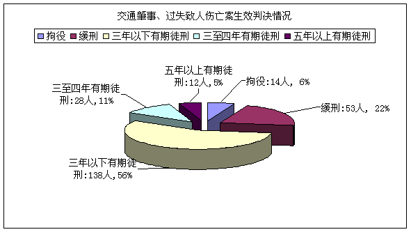 从表5可以看出:(1)被告人在三年以下刑期(包括拘役)幅度内判处刑罚的占84%左右,其中缓刑占22%,轻刑化趋势明显。这表明,大多数交通肇事、过失致人伤亡案件情节并不严重,部分案件被害人可能得到了加害方的有效赔偿,故而被告人得到从轻处罚。(2)被告人被判处三年以上刑罚的有40人,表明情节较为严重的交通肇事、过失致人死亡案件所占比重相对较低。
