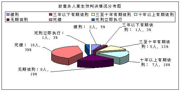 从表4可以看出:(1)被告人因故意杀人被判处十年以上刑期的达32人,占80%,其中死刑(包括死缓)17人,重型比例大。这表明,近八成的故意杀人案件均为情节严重的恶性杀人案件,被告人都被从重处罚。(2)有8名被告人在十年以下刑期判处刑罚,这表明,有二成的故意杀人案件属于情节较轻,被告人得到从轻处罚。