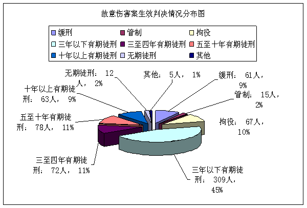 从表3可以看出:(1)对被告人判处轻刑所占比重大,非监禁刑占据11%以上,三年以下有期徒刑及拘役所占比例达55%。(2)判处重刑(十年徒刑以上)比例与非监禁刑比例相当,在三年以上徒刑判处刑罚的约占三分之一。以上刑期分布情况表明,有三分之二左右的案件为轻伤害案件,故而可以在法定刑三年以下判处刑罚;有一成的故意伤害案造成了被害人死亡或严重残疾的后果,故而被告人被判处十年以上徒刑;三分之一以上的故意伤害案致被害人重伤,故而在法定刑三年以上判处被告人刑罚[⑦]。